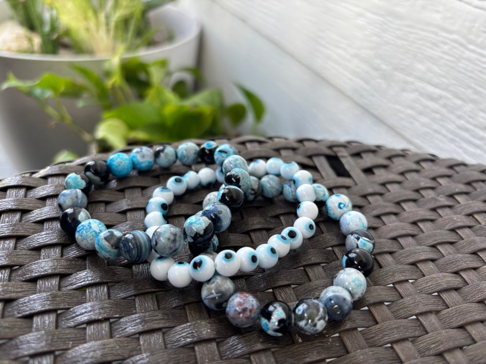 Immerse yourself in the gentle strength of the Blue Safe Tides bracelet bundle—a spiritual companion crafted to soothe the soul and shield the spirit. Featuring a harmonious blend of oceanic blues, grounding blacks, and pure whites.