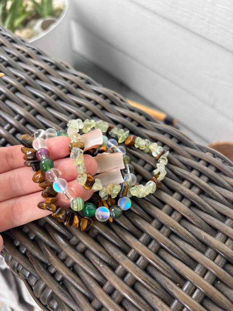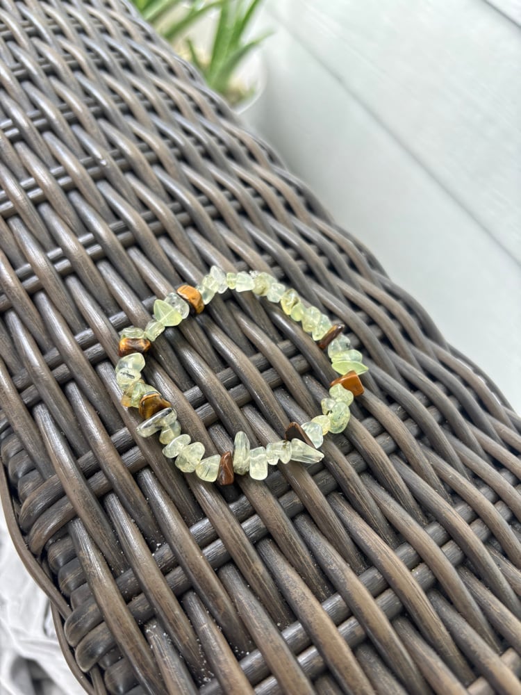 A harmony of grounding and grace - this bracelet blends the luminous energy of Prehnite, the stone of inner knowing and heart awakening, with the earthy power of Tiger's Eye, a guardian of strength, stability, and protection.