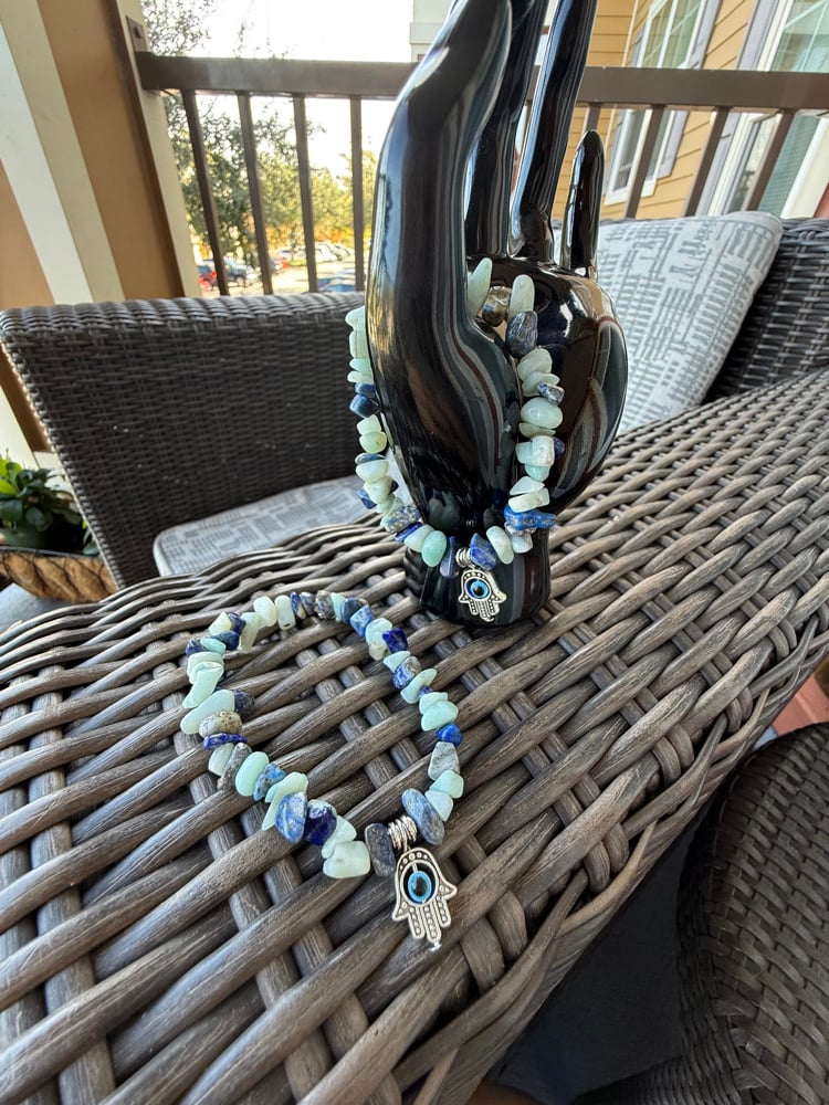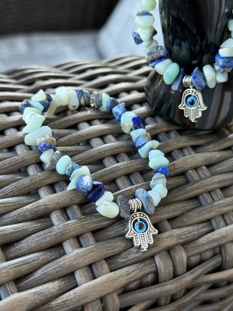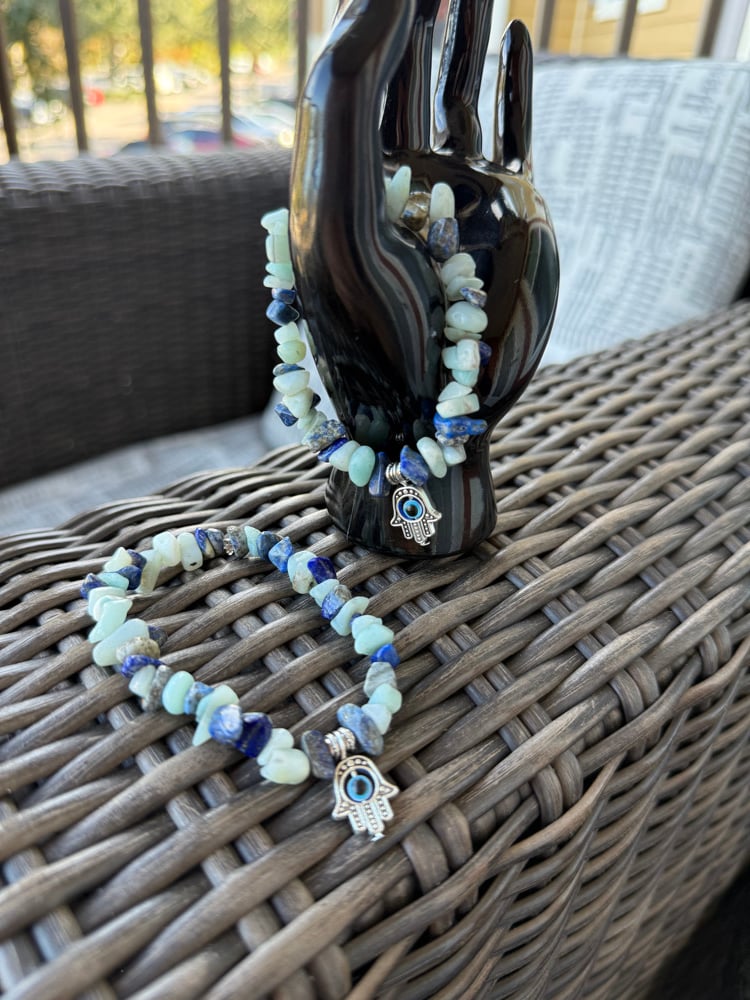 The Starlight Guardian Bracelet is a powerful talisman of protection, truth, and calm. Amazonite soothes the spirit and encourages emotional balance, while lapis lazuli activates inner wisdom and authentic self-expression. Finished with a Hamsa and Evil Eye charm, this bracelet is designed to shield against negative energy while guiding you with clarity and confidence.