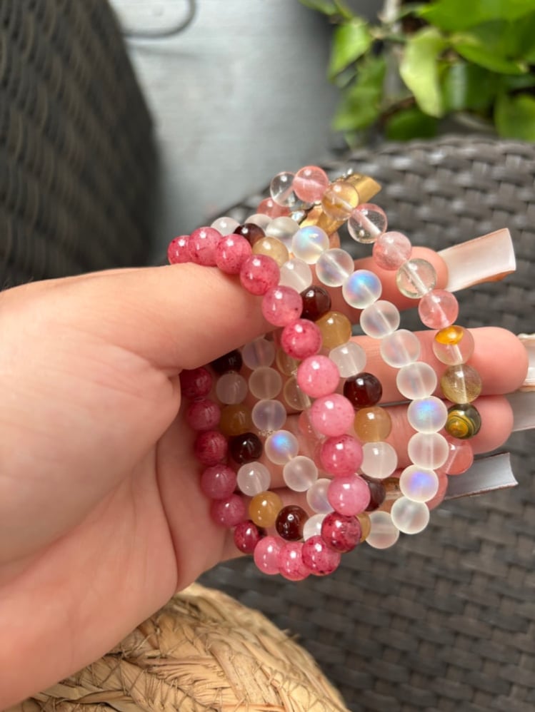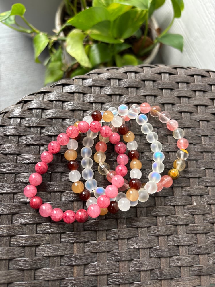 Our Strawberry Stardust Bracelets are a radiant blend of juicy pink strawberry quartz, glowing moonstone, and sun-kissed crystal beads — each one chosen to elevate your spirit.
